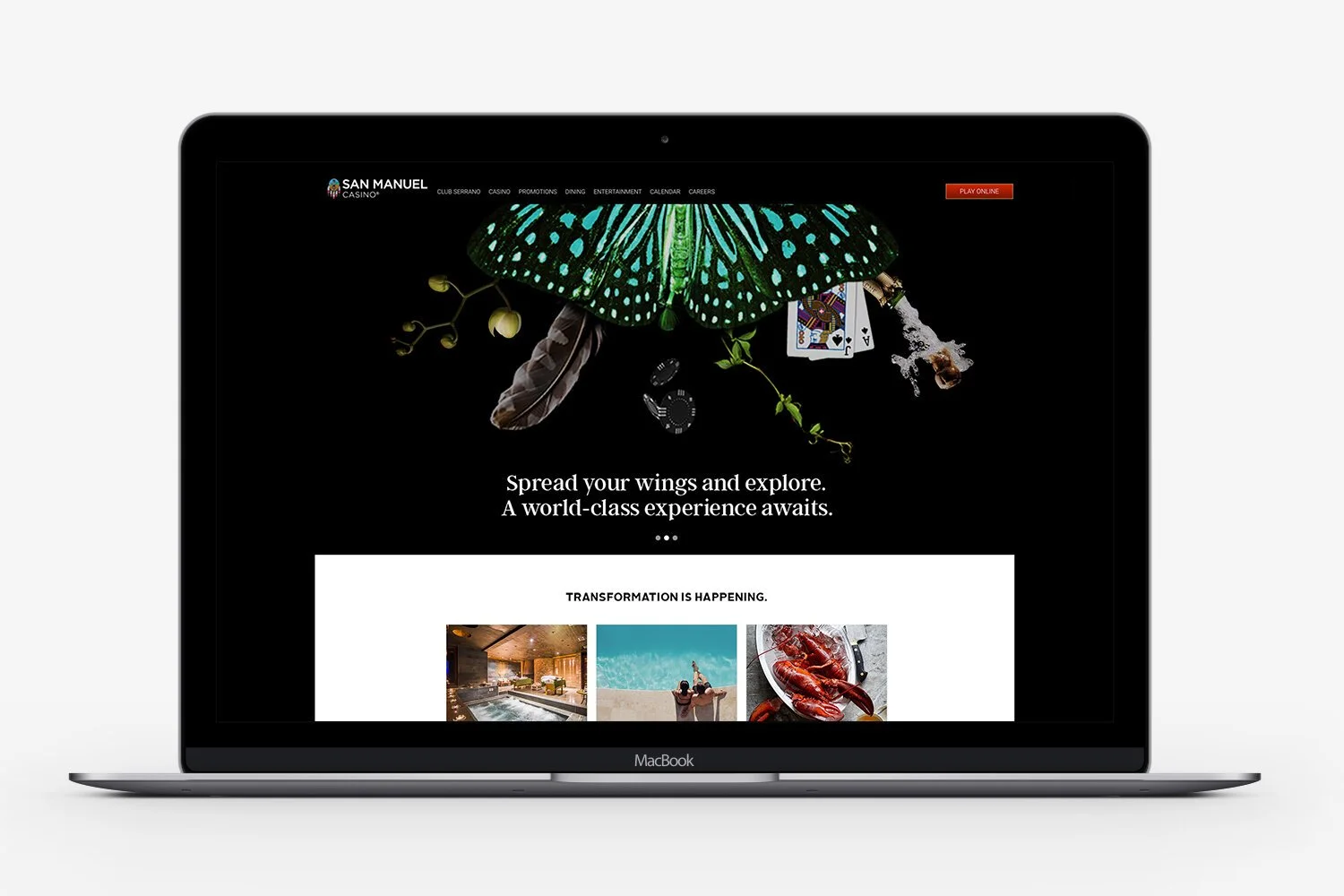 San Manuel Casino and Resort was undergoing a massive reconstruction project to expand their amenities and elevate their overall experience, and needed a campaign to speak to that. So we pitched them the concept of metamorphosis. We positioned San Manuel as going through a natural and beautiful transformation in which they would come out more elegant and evolved, like a butterfly coming out of a cocoon or a snake shedding its skin. Then we brought it to life in print, OOH, web, digital and social.